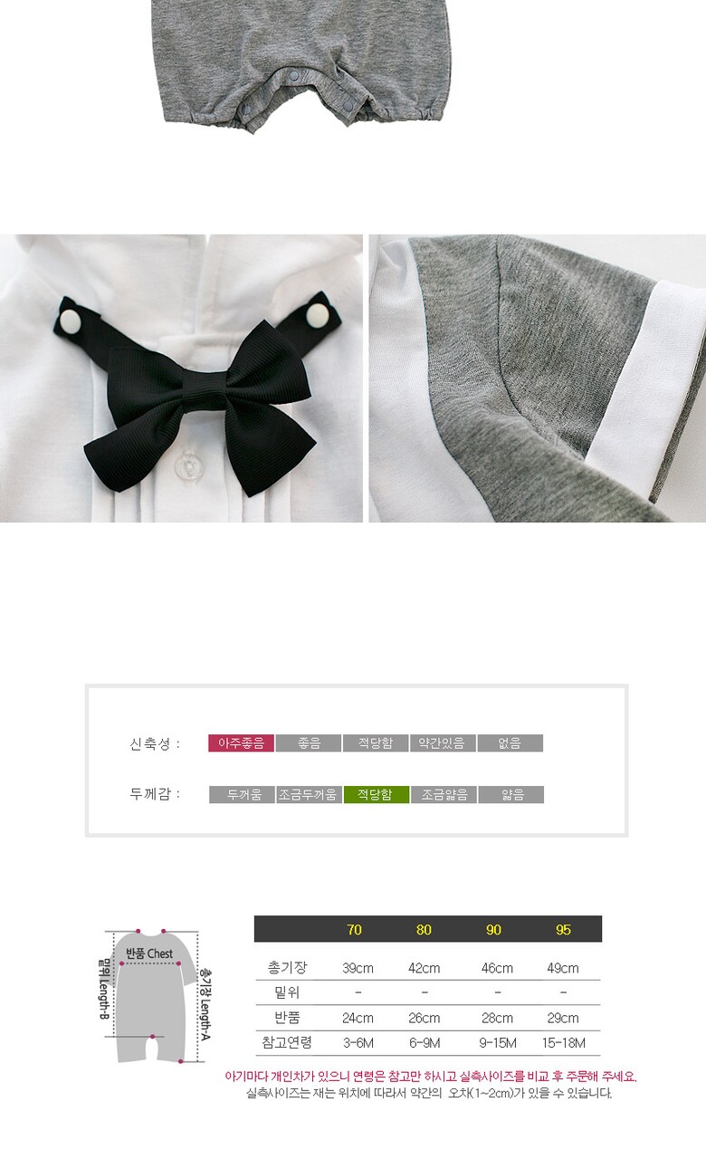 리본형 보타이가 탈부착 가능한 레슬리 보타이 롬퍼입니다. 보타이만 부착해주면 드레시한 정장풍 외출복 롬퍼가 됩니다. 상의와 기저귀스냅이 오픈되는 반타개스타일입니다.