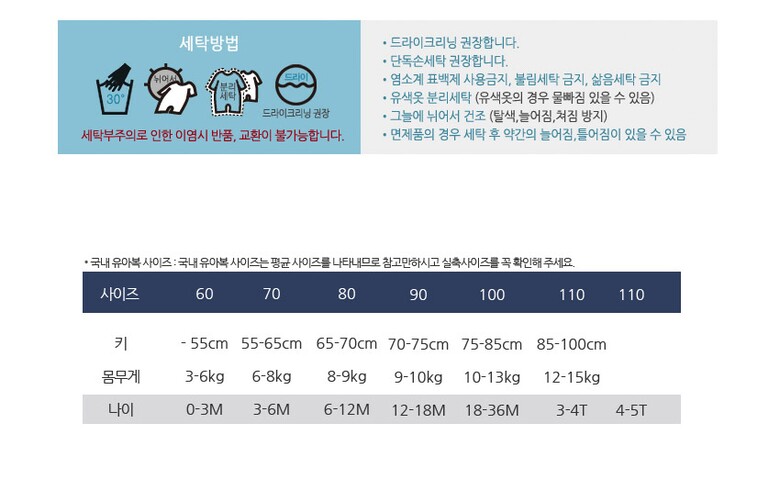 6. 세탁방법 및 취급시 주의사항 | 드라이클리닝 권장. 미온수에 유아용 중성세제로 단독 손세탁가능, 그늘건조권장 |