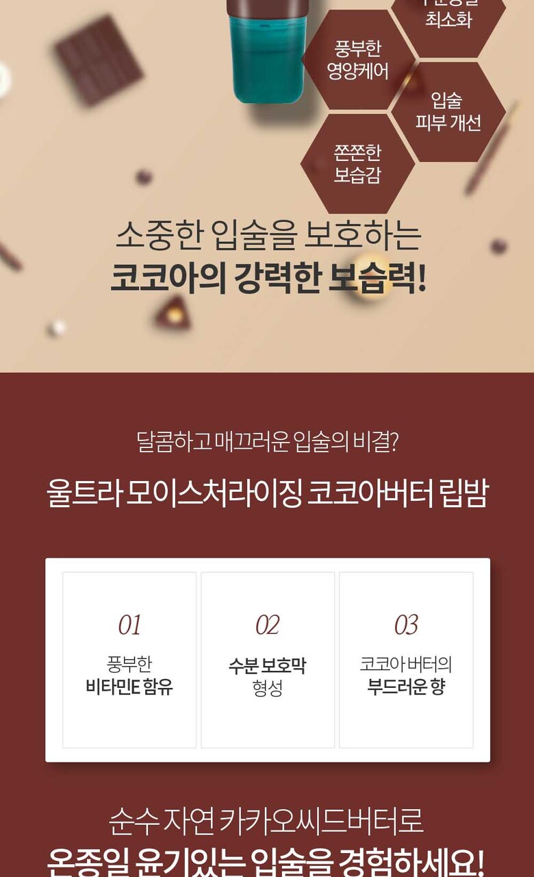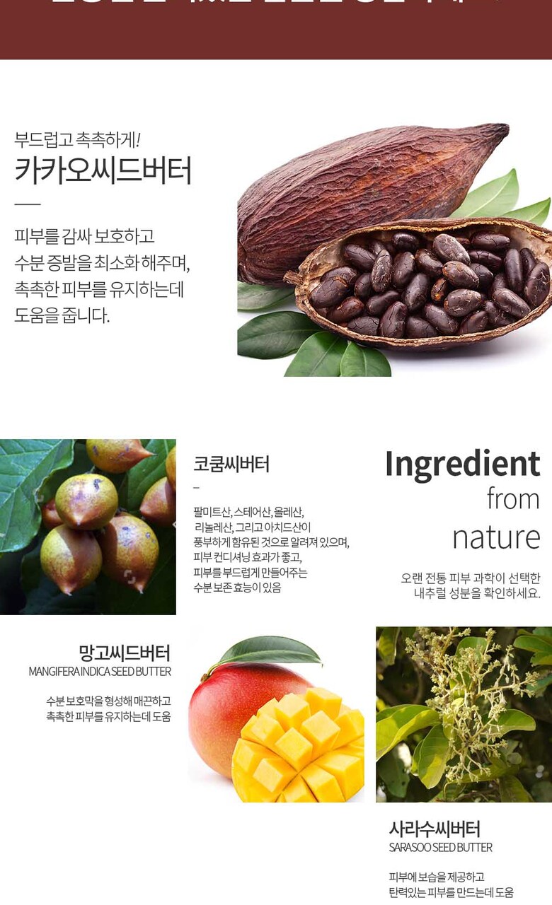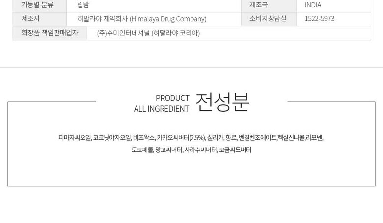 7. 주요성분 | 피마자씨오일, 코코넛야자오일, 비즈왁스, 카카오씨버터, 실리카, 향료, 토코페롤, 망고씨버터, 살트리씨버터, 코쿰씨버터 |