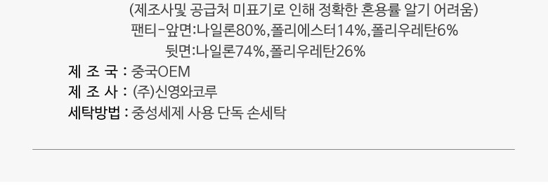1. 제품 소재 (섬유의 조성 또는 혼용률을 백분율로 표시, 기능성인 경우 성적서 또는 허가서) | 브라-나일론,폴리에스터,기타(제조사미제공 혼용률 알수없음) 팬티-앞면:나일론80%,폴리에스터14%,폴리우레탄6% 뒷면:나일론74%,폴리우레탄26% |