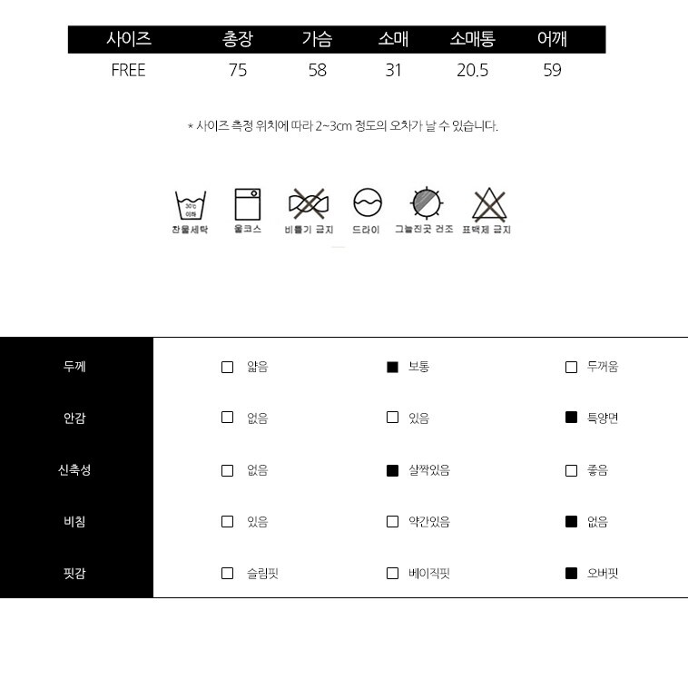 1. 제품 소재 (섬유의 조성 또는 혼용률을 백분율로 표시, 기능성인 경우 성적서 또는 허가서) | 상세페이지참조 |