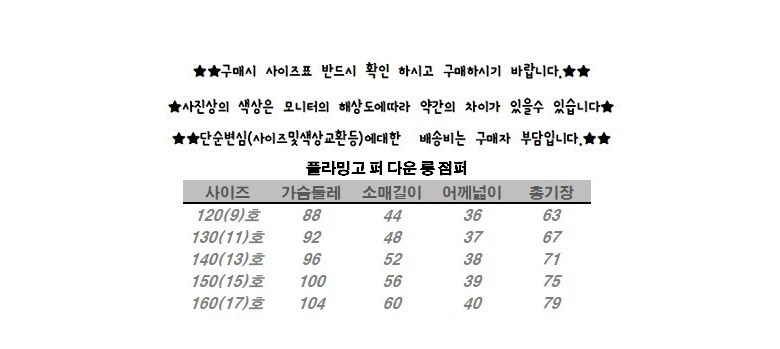 1. 제품 소재 (섬유의 조성 또는 혼용률을 백분율로 표시, 기능성인 경우 성적서 또는 허가서) 겉감 : 폴리 100% 안감 폴리 100%충전재 오리털 솜털 80% 깃털 20%