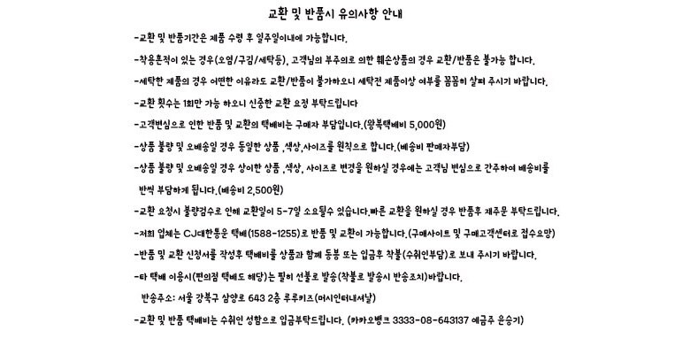 • 처음 배송된 상품상태와 다를 경우(세탁/착용 후 외출하신 경우) 반품이 불가합니다.