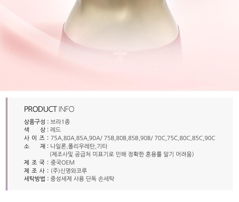 | 1. 제품 소재 (섬유의 조성 또는 혼용률을 백분율로 표시, 기능성인 경우 성적서 또는 허가서) | 브라-나일론,폴리우레탄,기타(제조사및 공급처 미표기로 인해 정확한 혼용률 알기 어려움) |