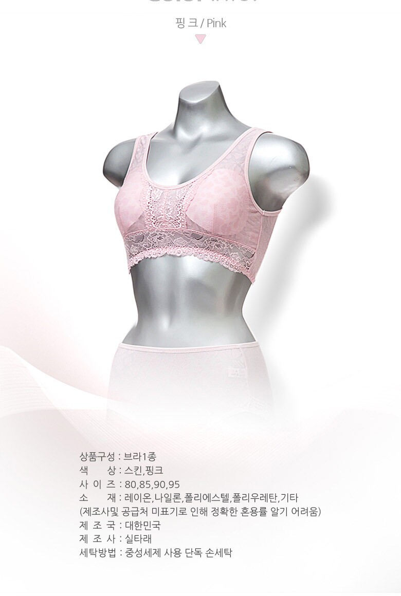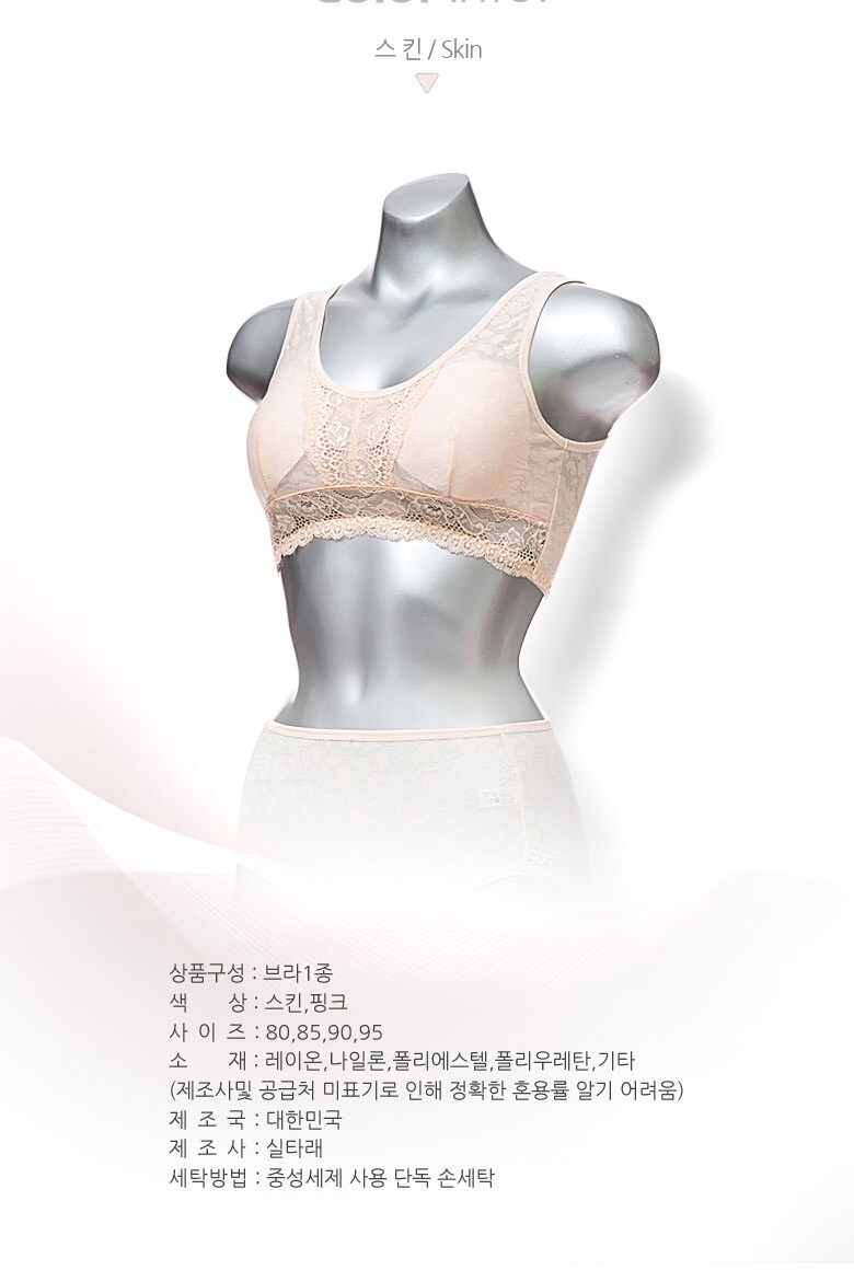 1. 제품 소재 (섬유의 조성 또는 혼용률을 백분율로 표시, 기능성인 경우 성적서 또는 허가서) 브라:레이온,나일론,폴리에스텔,폴리우레탄,기타(제조사및 공급처 미표기로 인해 정확한 혼용률 알기 어려움)