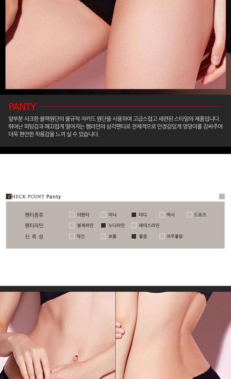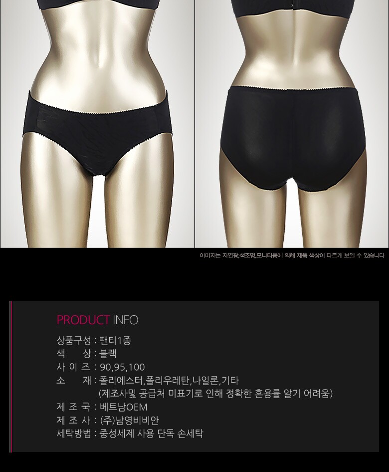 | 1. 제품 소재 (섬유의 조성 또는 혼용률을 백분율로 표시, 기능성인 경우 성적서 또는 허가서) | 팬티:폴리에스터,폴리우레탄,나일론,기타(제조사및 공급처 미표기로 인해 정확한 혼용률 알기 어려움) |