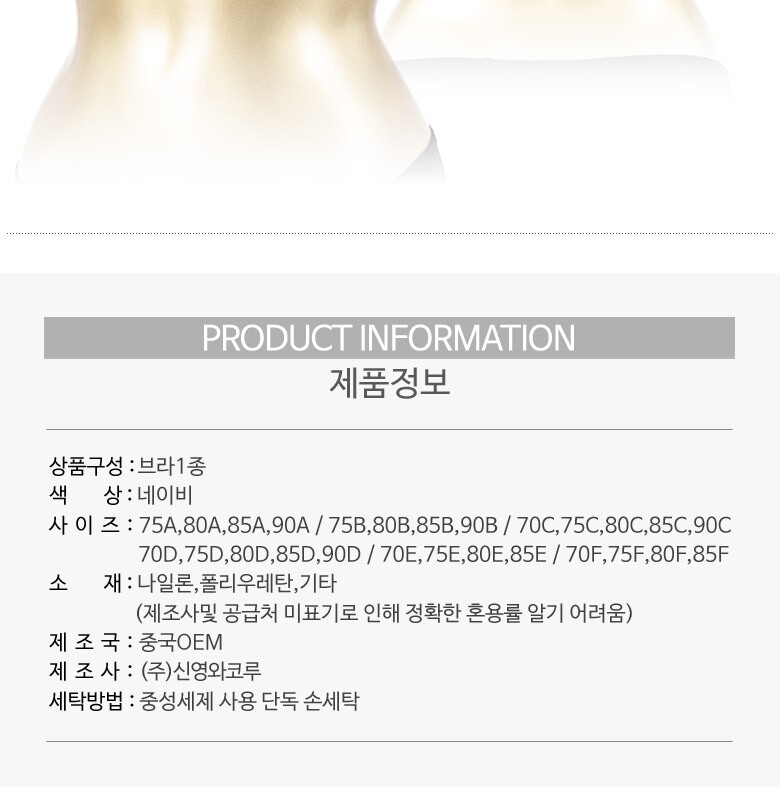 1. 제품 소재 (섬유의 조성 또는 혼용률을 백분율로 표시, 기능성인 경우 성적서 또는 허가서) | 브라-나일론,폴리우레탄,기타(제조사미제공 혼용률 알수없음) |
