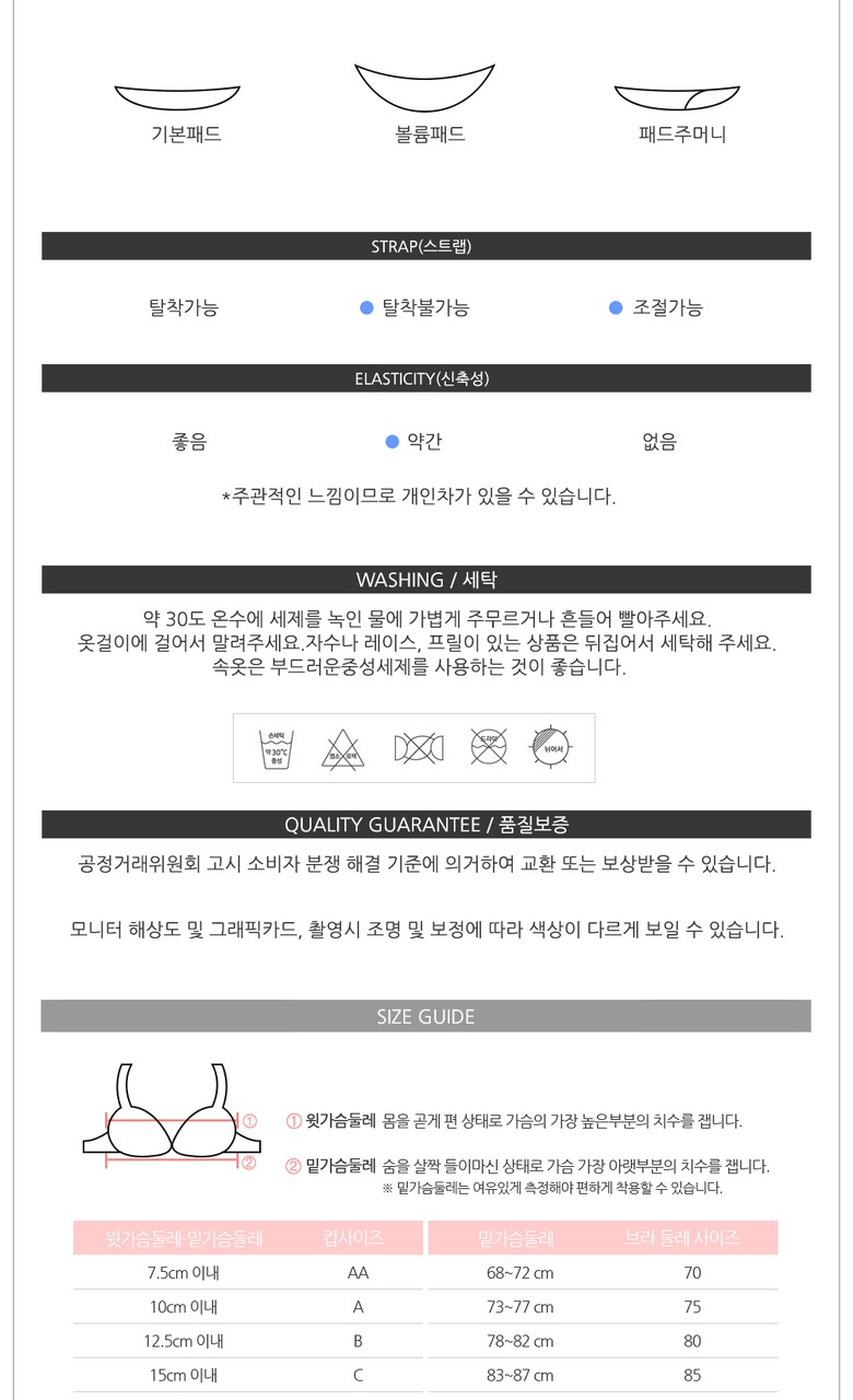 | 6. 세탁방법 및 취급시 주의사항 | 30도 온수로 중성세제를 사용하여 손세탁 및 분리세탁을 권장합니다. |