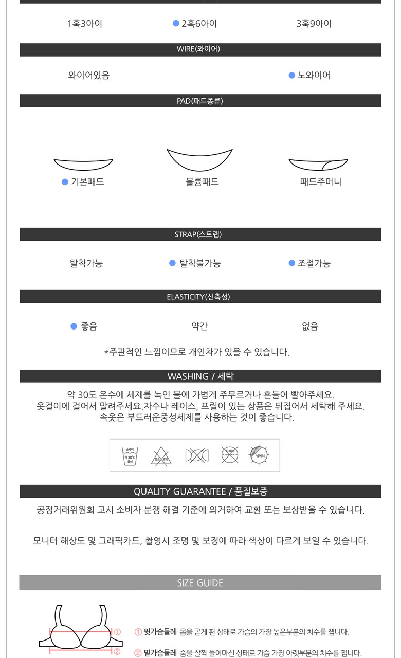 | 6. 세탁방법 및 취급시 주의사항 | 30도 온수로 중성세제를 사용하여 손세탁 및 분리세탁을 권장합니다. |