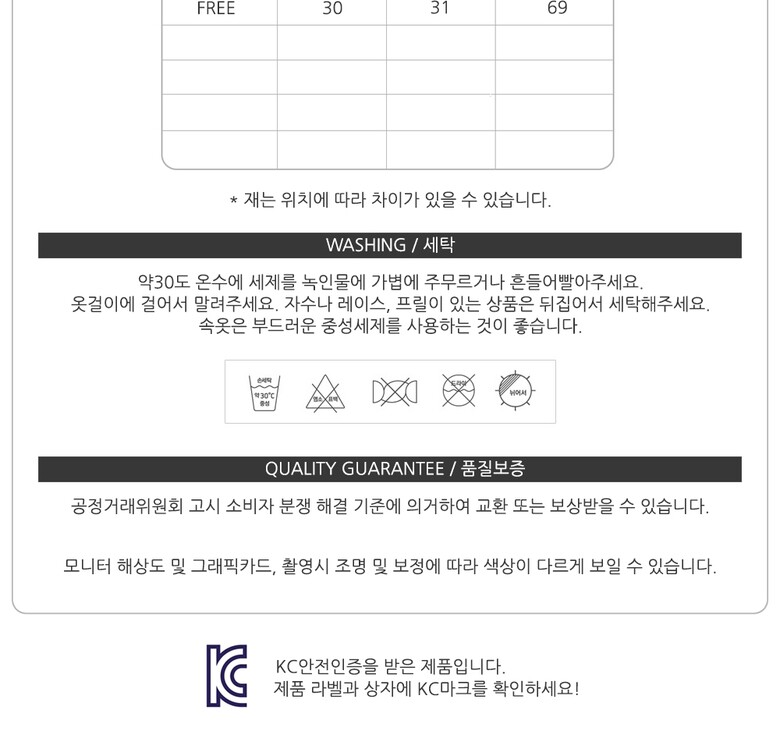 | 6. 세탁방법 및 취급시 주의사항 | 30도 온수로 중성세제를 사용하여 손세탁 및 분리세탁을 권장합니다. |