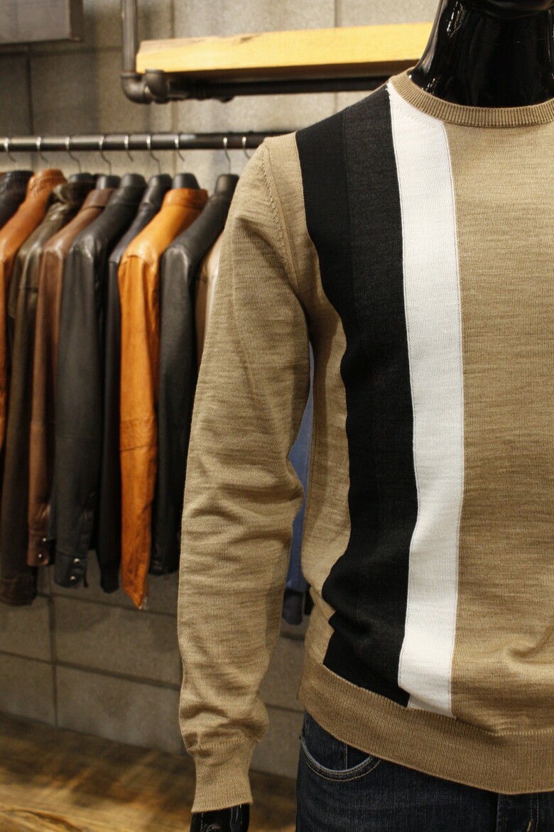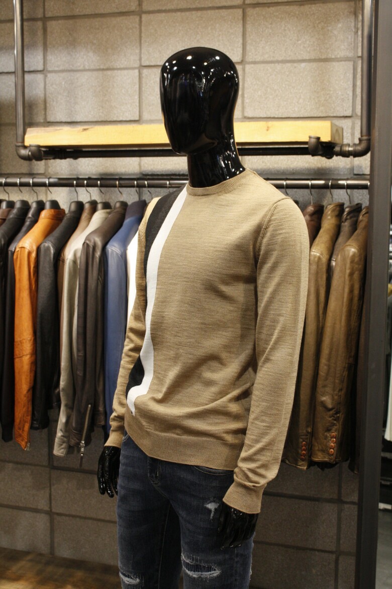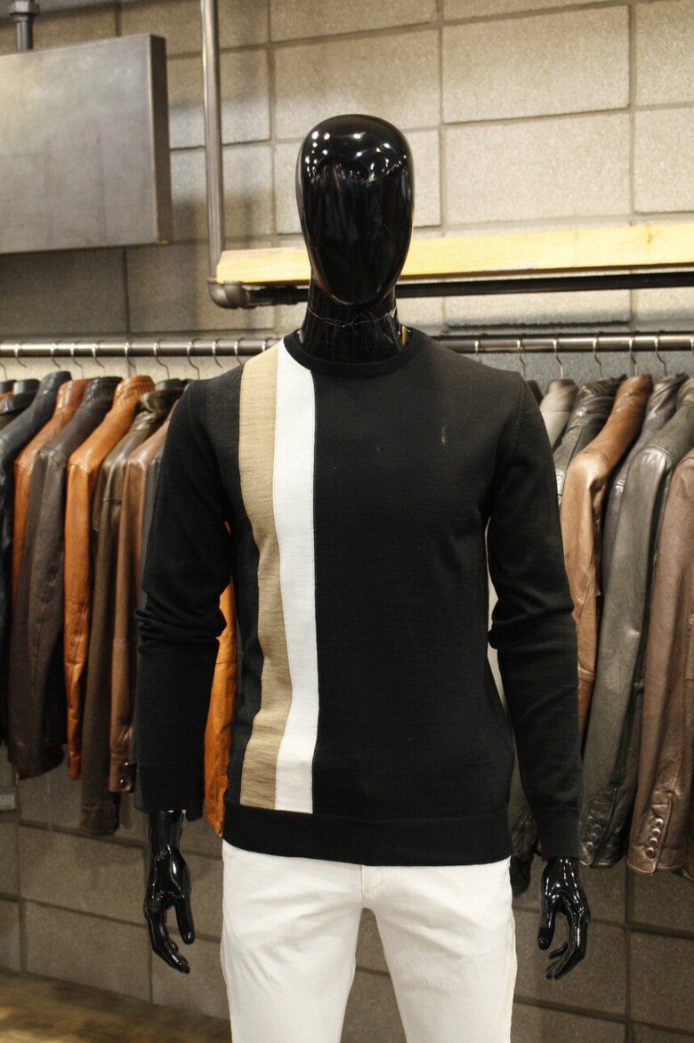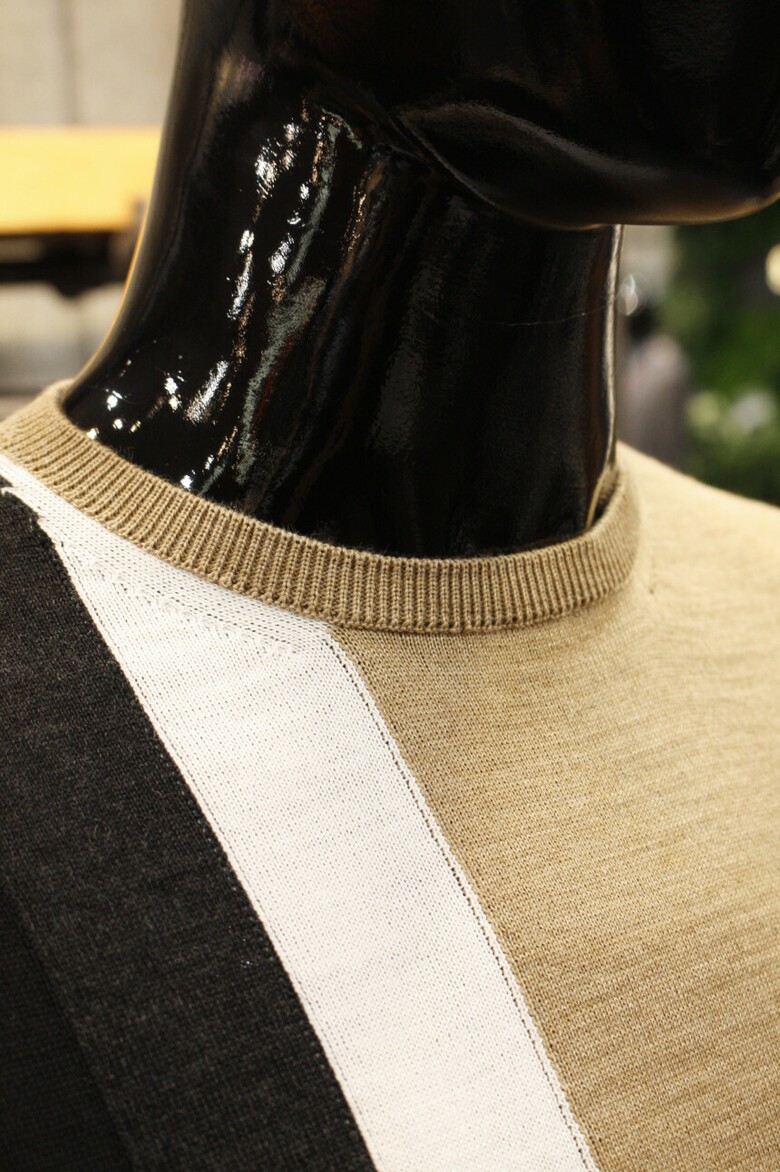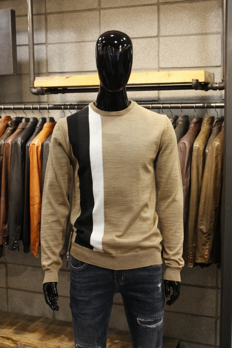 유니크한 삼선배색으로 세련된 이태리직수입 라운드넥 니트 입니다