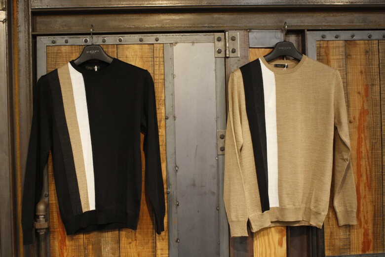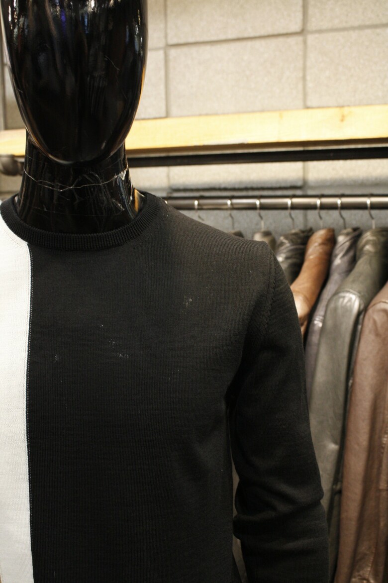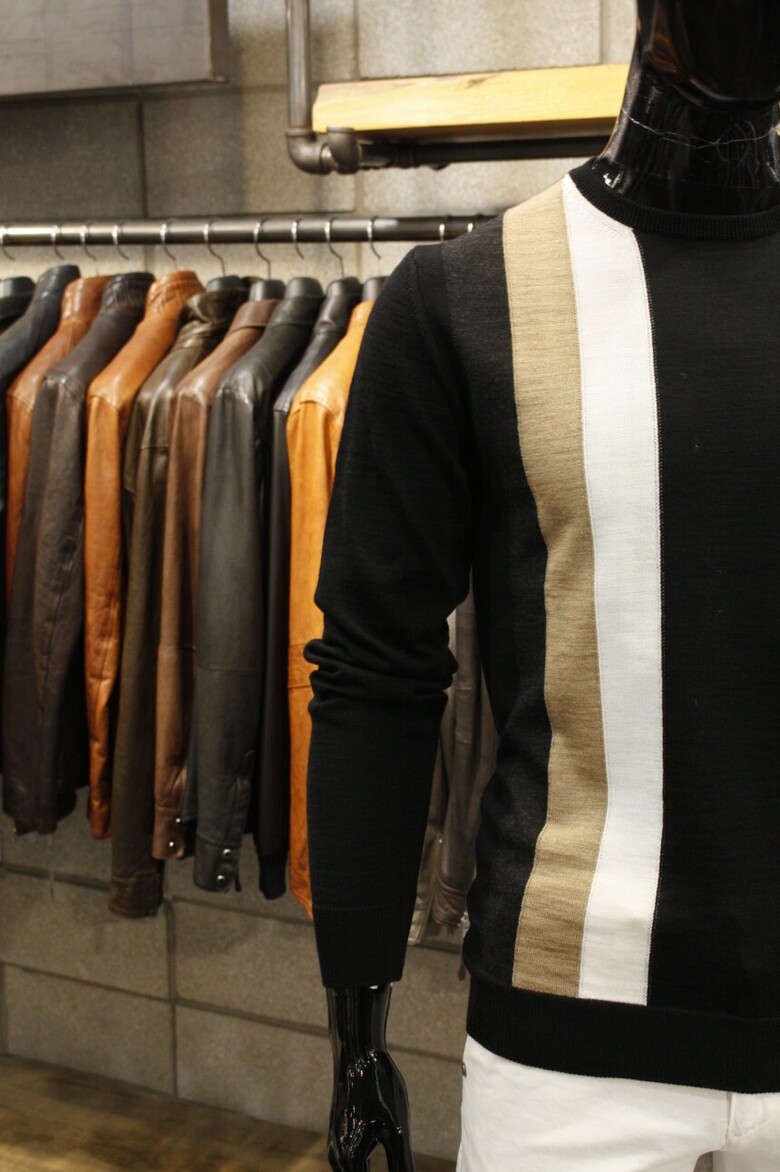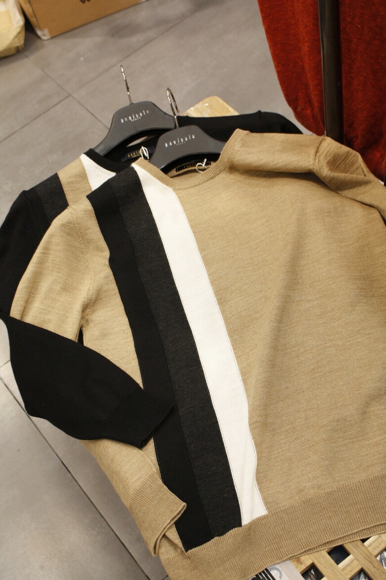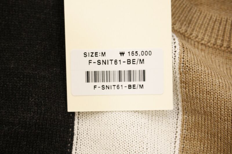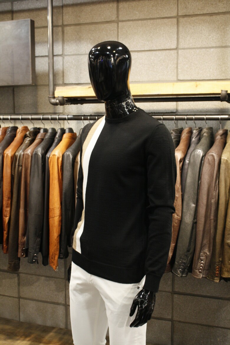 유니크한 삼선배색으로 세련된 이태리직수입 라운드넥 니트 입니다