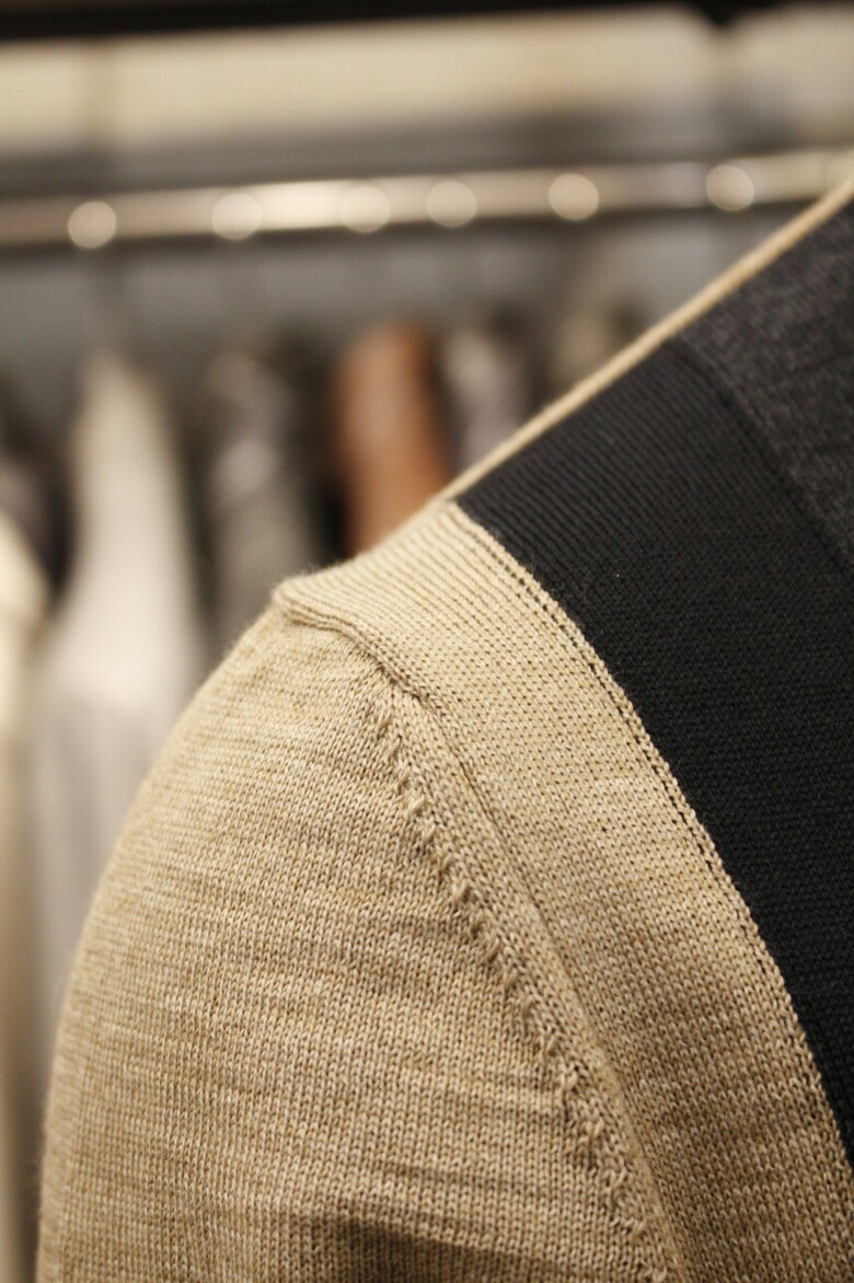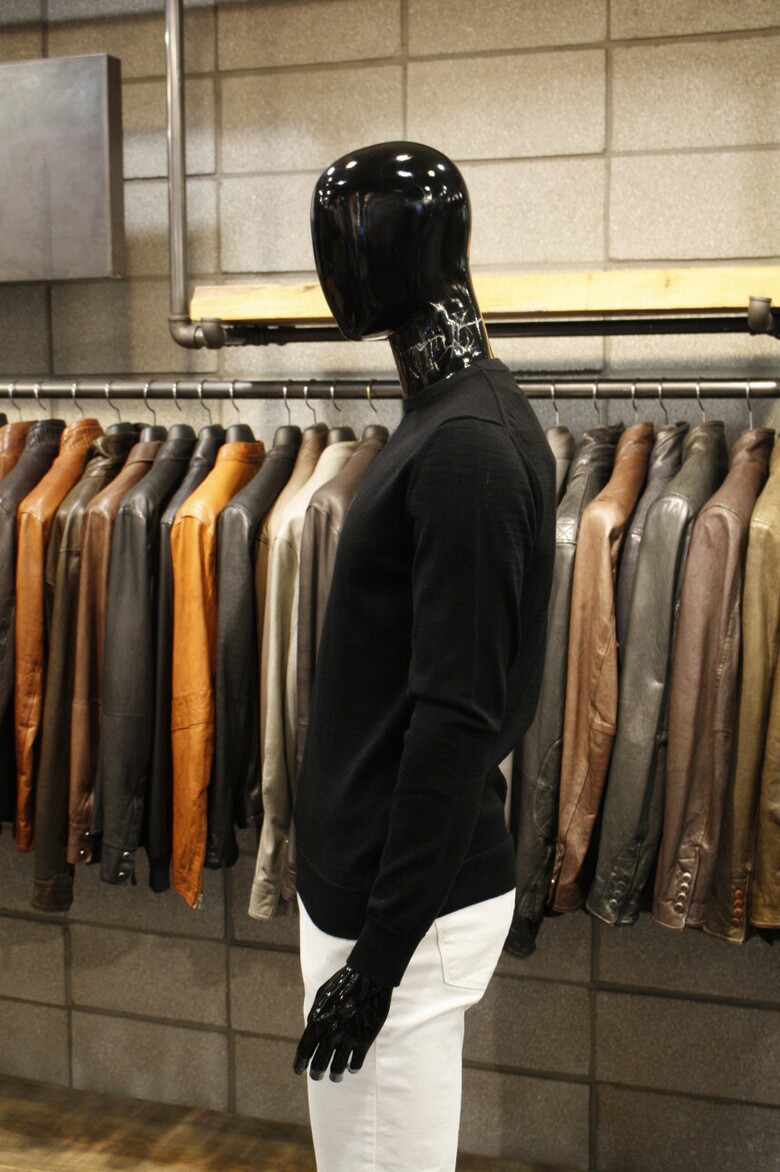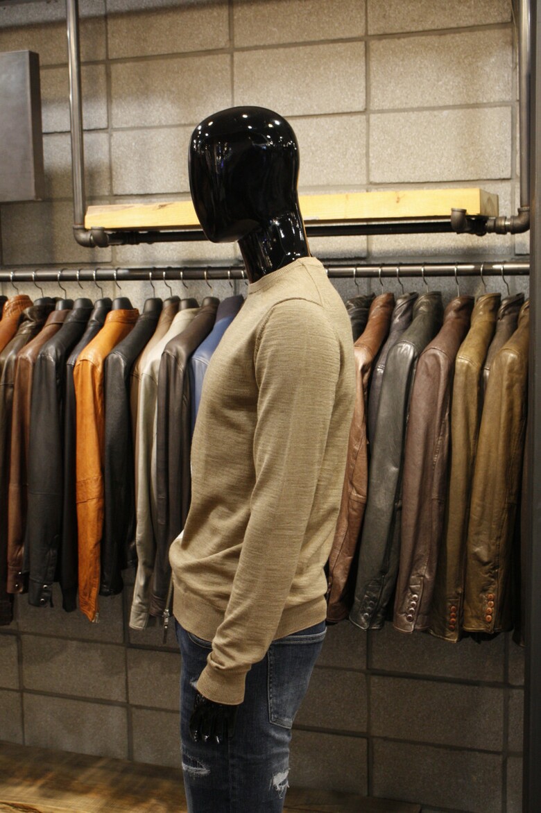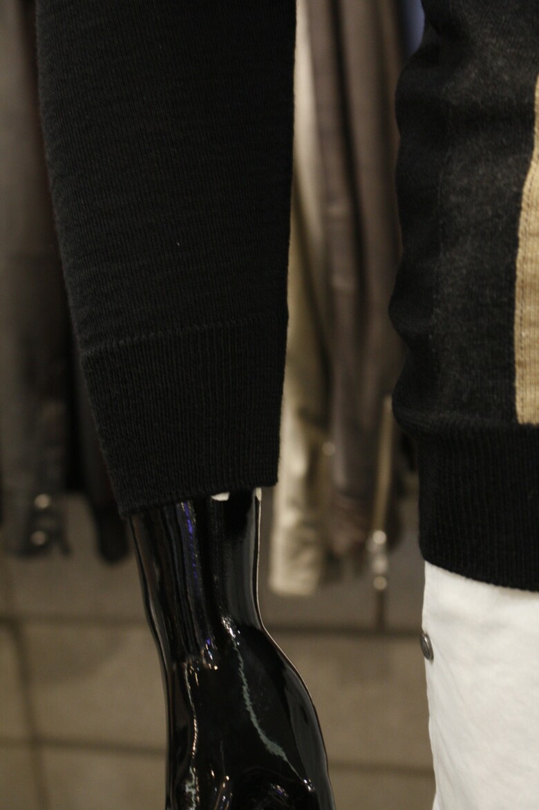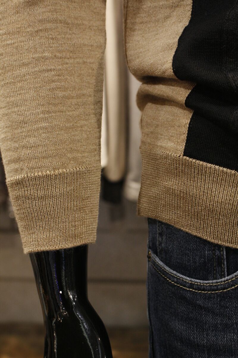 유니크한 삼선배색으로 세련된 이태리직수입 라운드넥 니트 입니다