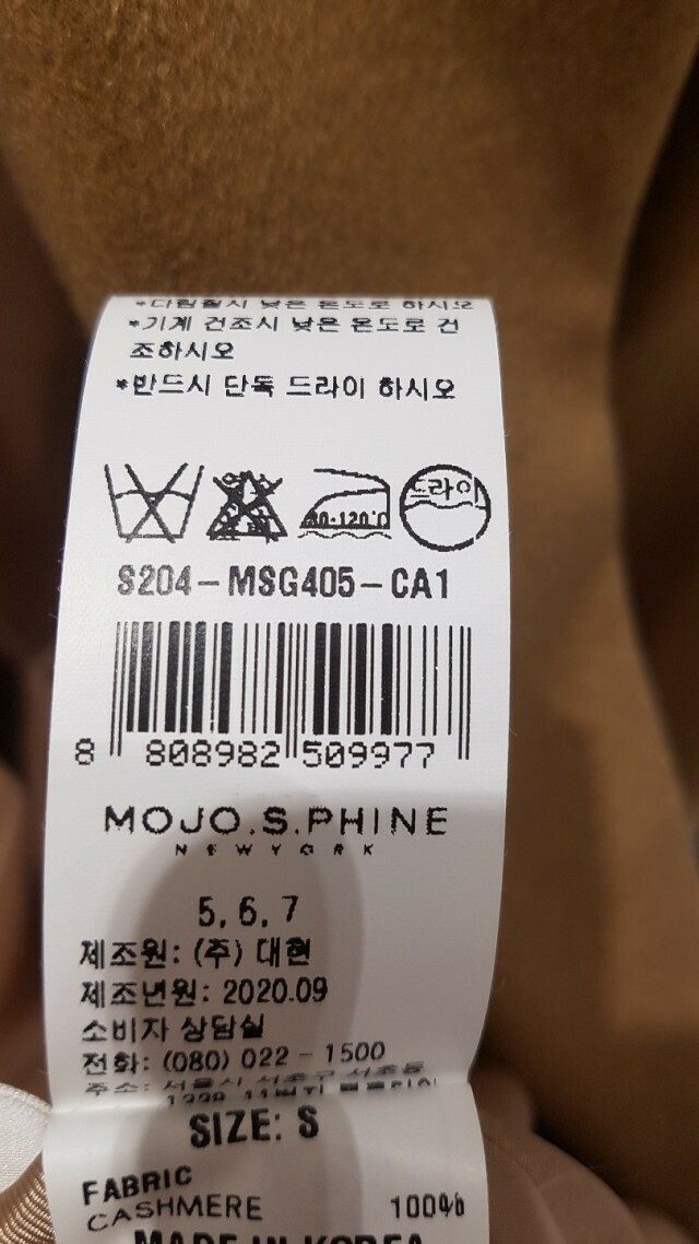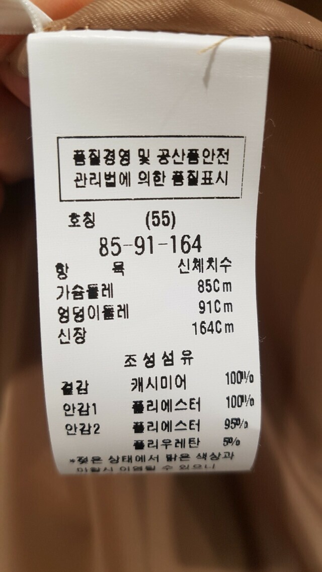 | 1. 제품 소재 (섬유의 조성 또는 혼용률을 백분율로 표시, 기능성인 경우 성적서 또는 허가서) | 겉감:캐시미어 100%, 폴리에스테르 100%, 우레탄 / 패브릭 |