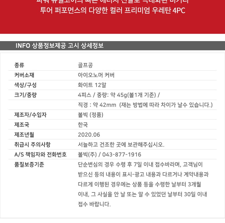 2. 크기, 중량 | 4피스 / 중량: 약 45g(볼 1개 기준) / 직경: 약 42mm (재는 방법에 따라 차이가 날 수 있습니다) |
