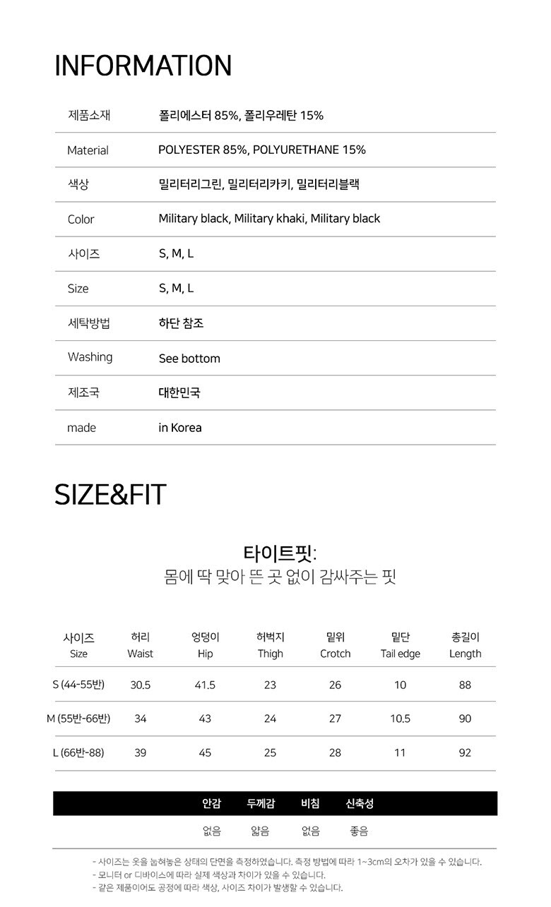 | 1. 제품 소재 (섬유의 조성 또는 혼용률을 백분율로 표시, 기능성인 경우 성적서 또는 허가서) | 폴리85%.스판15% |