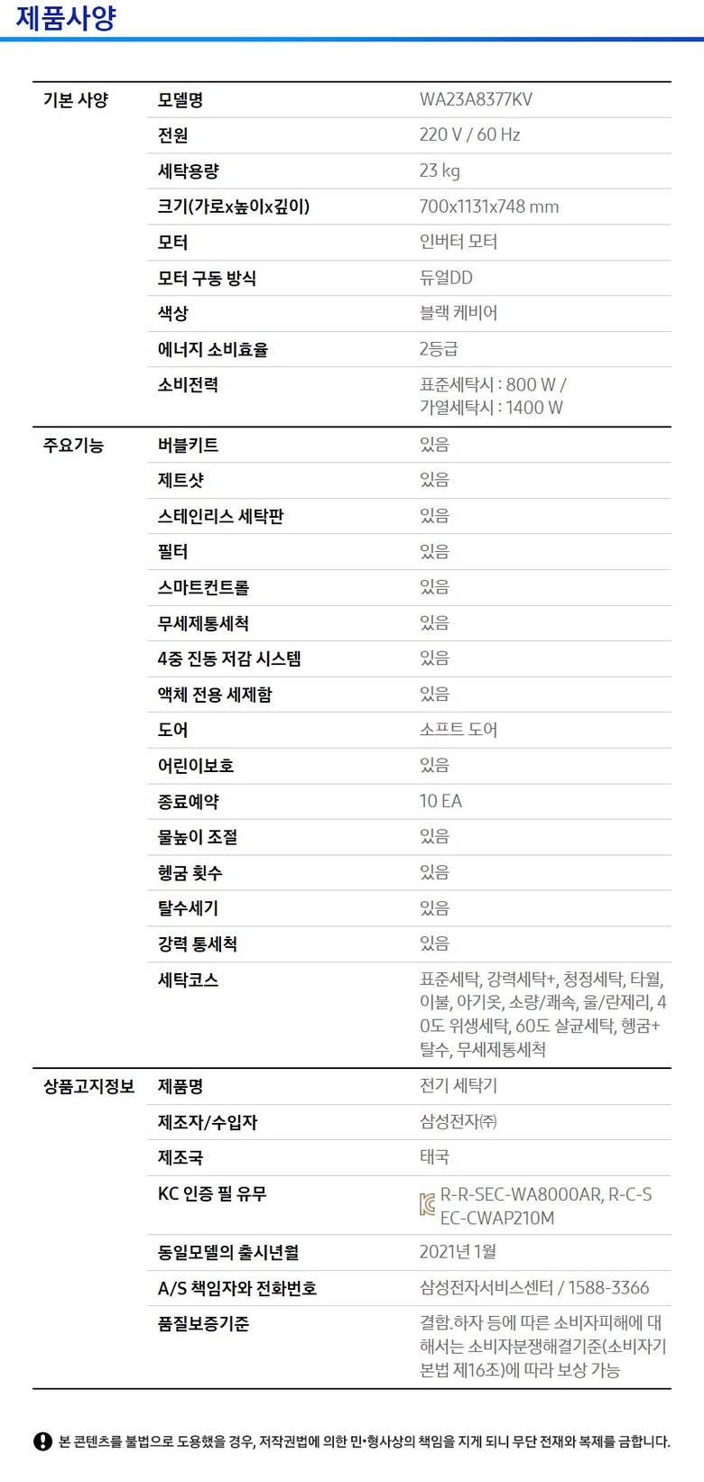 1. 모델명(품번) | WA23A8377KV |
