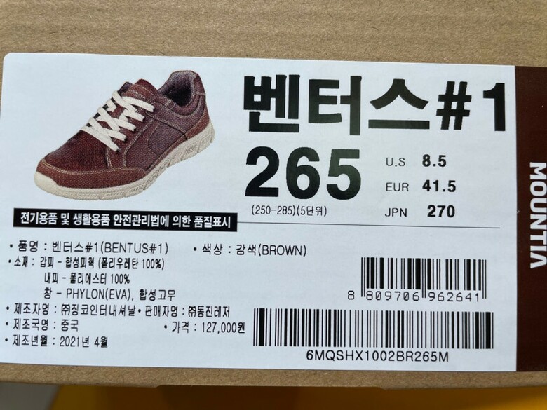 | 1. 제품 소재 (운동화인 경우에는 겉감, 안감을 구분하여 표시) | 갑피 - 갑피 - 합성피혁 (폴리우레탄 100%) 내피 - 폴리에스터 100% |