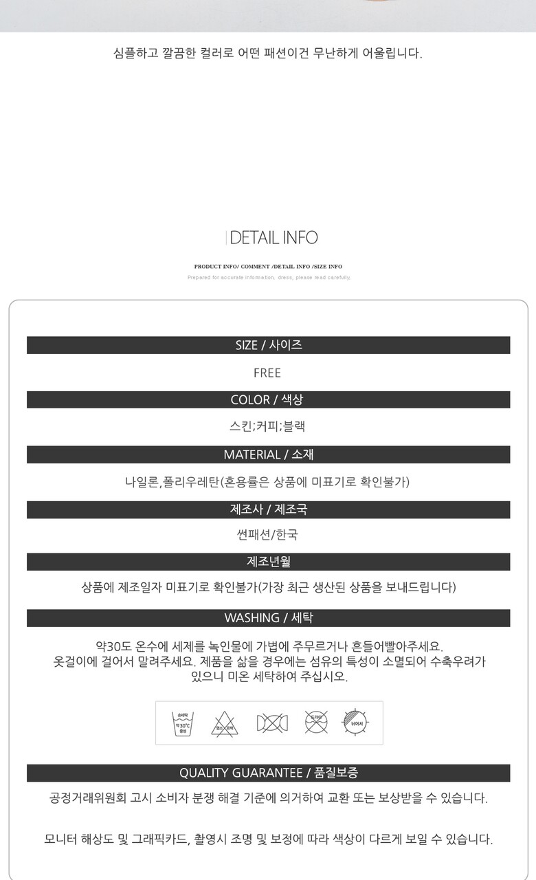 | 1. 제품 소재 (섬유의 조성 또는 혼용률을 백분율로 표시, 기능성인 경우 성적서 또는 허가서) | 나일론/폴리우레탄(혼용률은 상품에 미표기로 확인불가) |