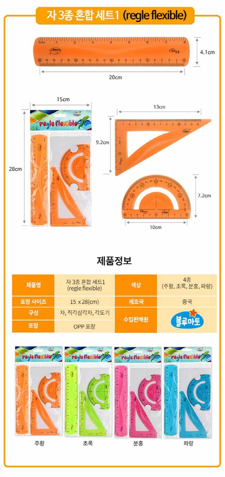 [블루마토] 삼각자외 자3종혼합세트1 (regle flexible)/ 15*28(cm) /OPP포장/4컬러(주황/초록/분홍/파랑)랜