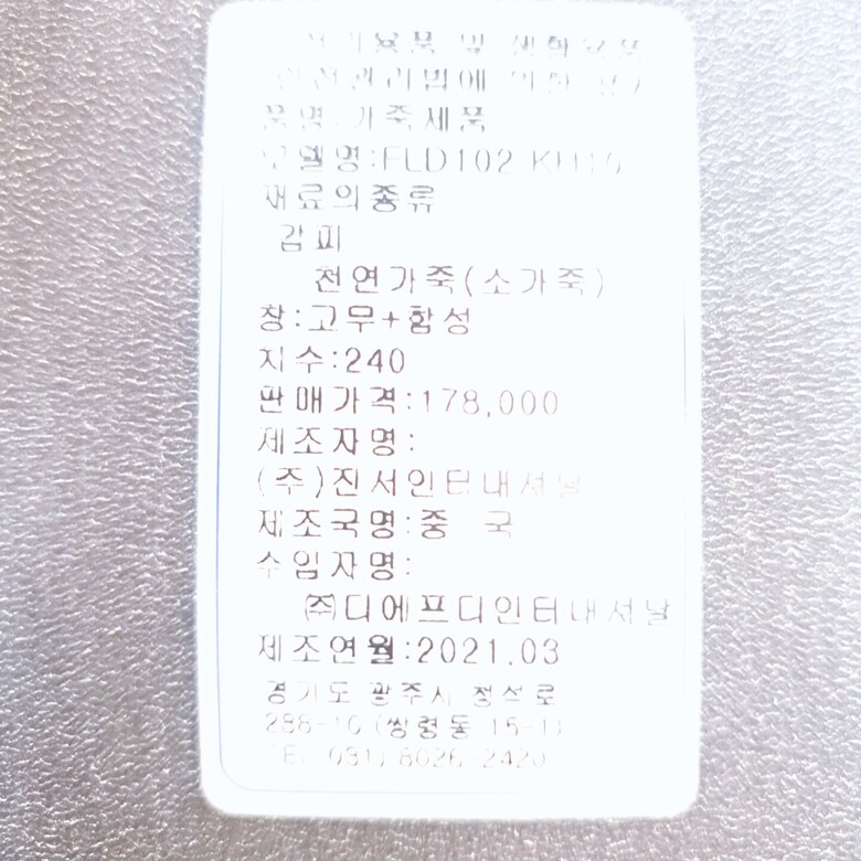 | 1. 제품 소재 (운동화인 경우에는 겉감, 안감을 구분하여 표시) | 소가죽 |