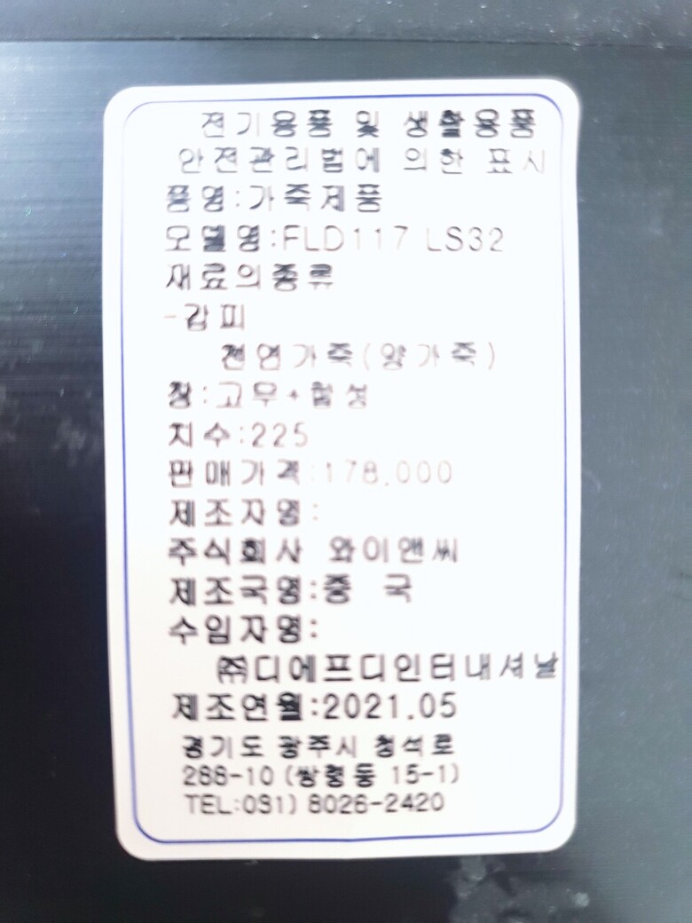 | 1. 제품 소재 (운동화인 경우에는 겉감, 안감을 구분하여 표시) | 양가죽 |