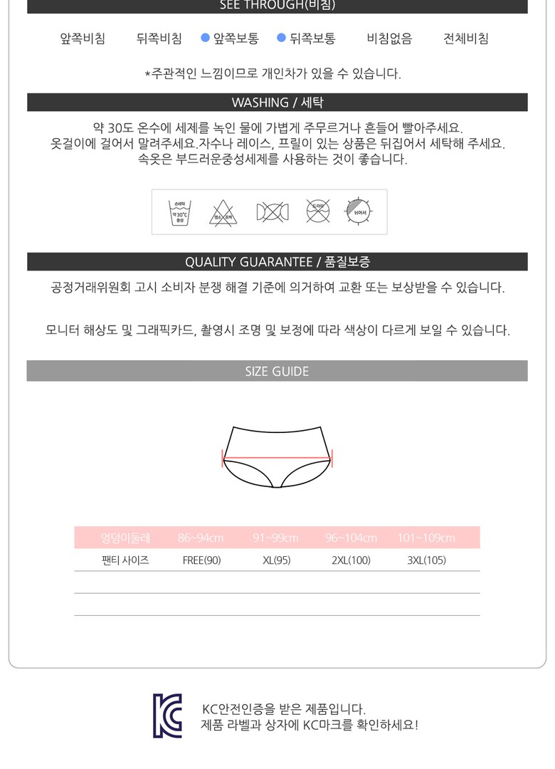 | 6. 세탁방법 및 취급시 주의사항 | 30도 온수로 중성세제를 사용하여 손세탁 및 분리세탁을 권장합니다. |