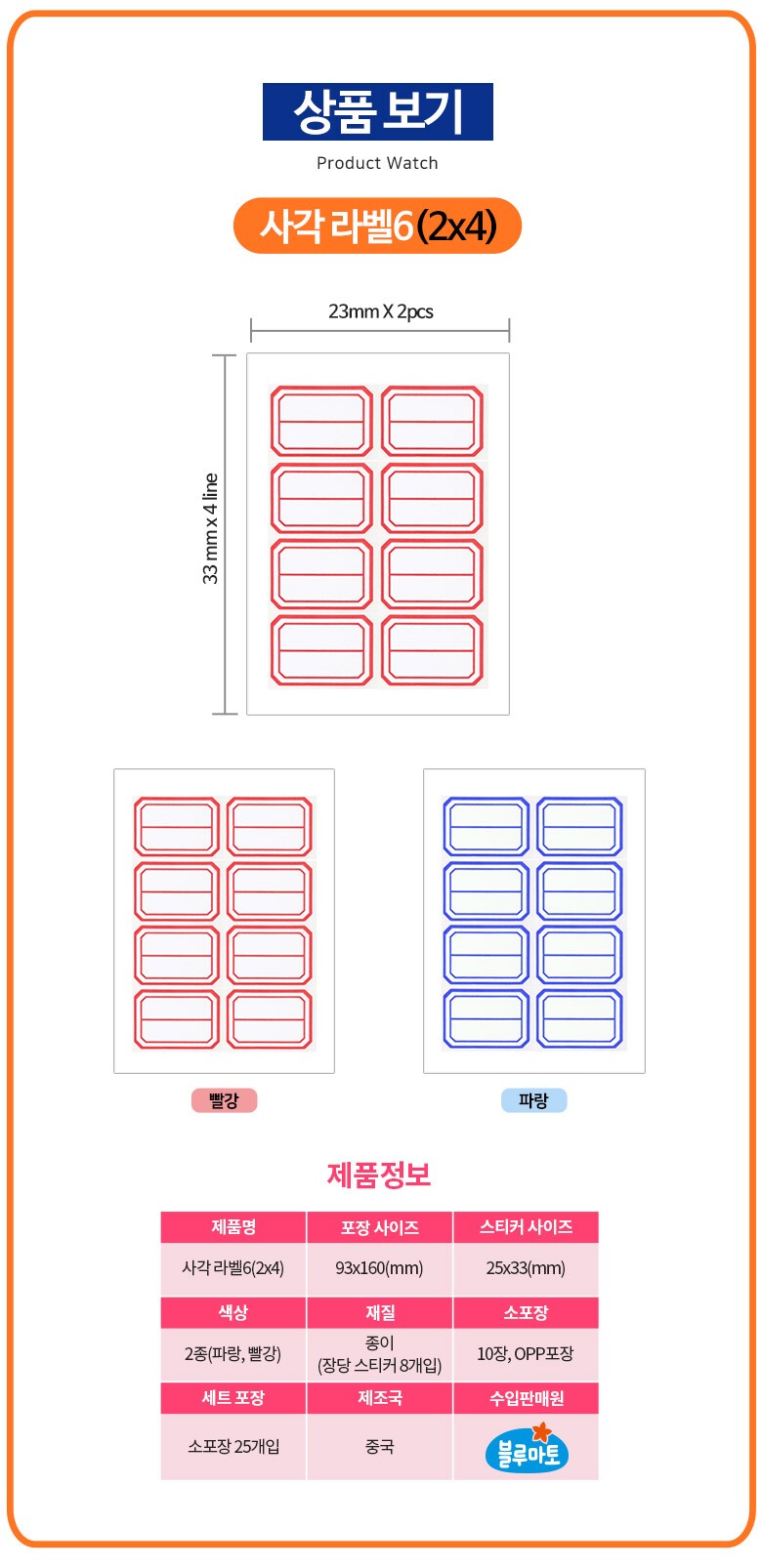 [블루마토] 사각라벨6(2*4), (1장-라벨8개)/(10P) /2색(빨강, 파랑 선택)