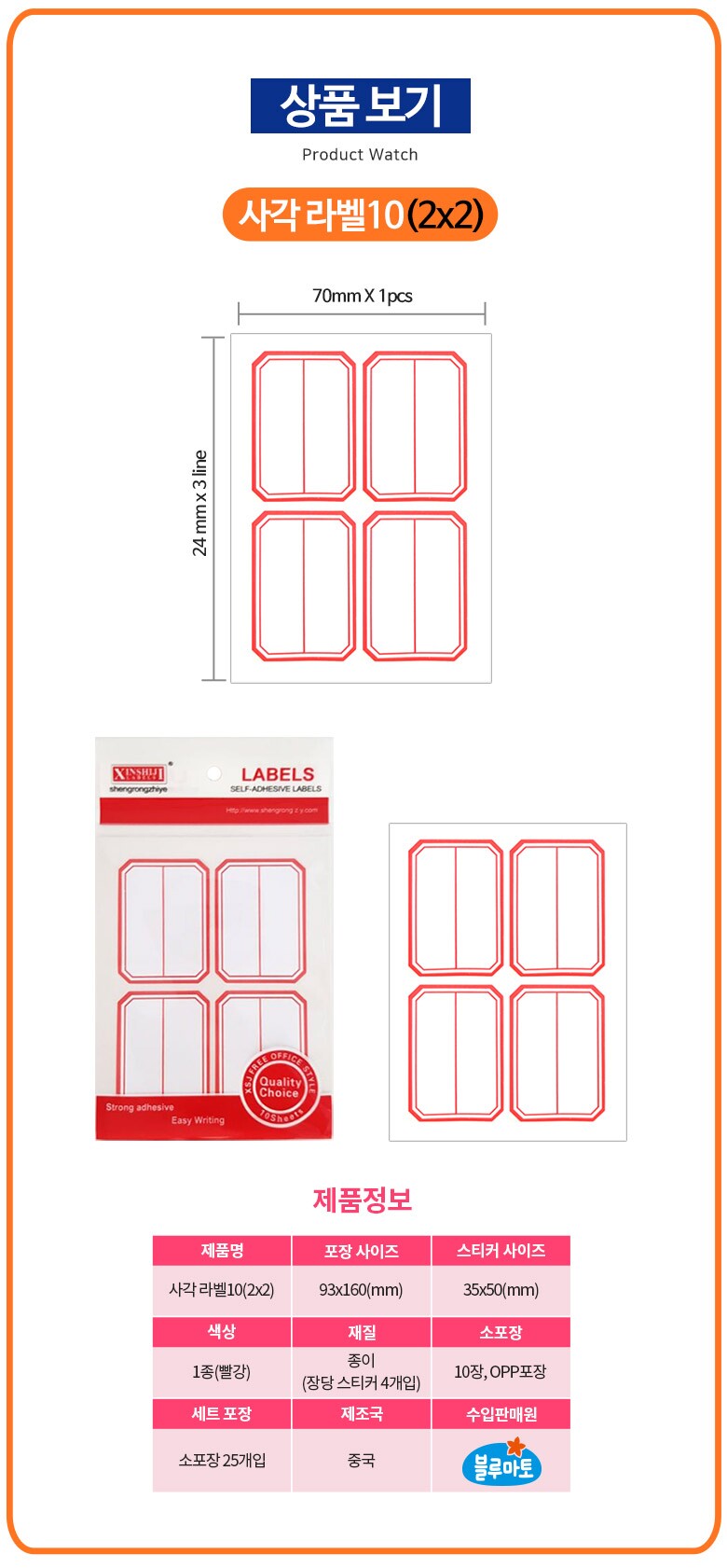 [블루마토] 사각라벨10(2*2), (1장-라벨4개)/(10P) /빨강(단품)
