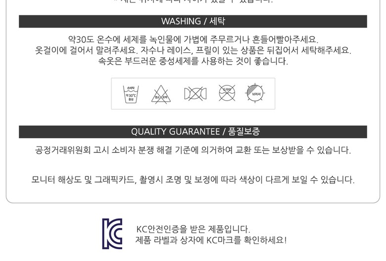 | 6. 세탁방법 및 취급시 주의사항 | 30도 온수로 중성세제를 사용하여 손세탁 및 분리세탁을 권장합니다. |