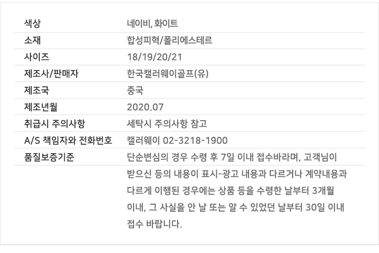 | 8. A/S 책임자와 전화번호 | 캘러웨이코리아/02-3218-1900 |