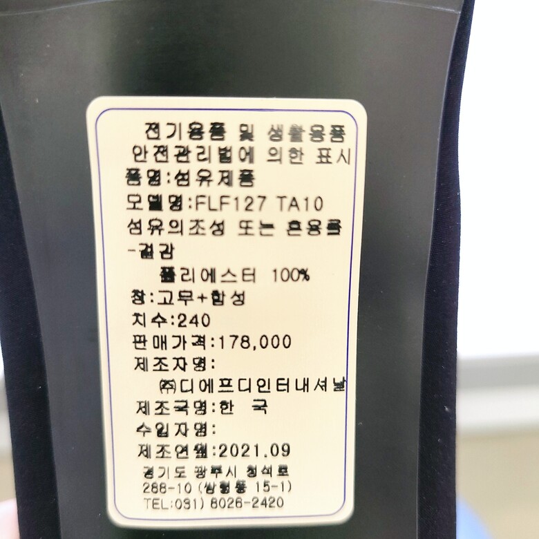 | 1. 제품 소재 (운동화인 경우에는 겉감, 안감을 구분하여 표시) | 폴리에스터 |