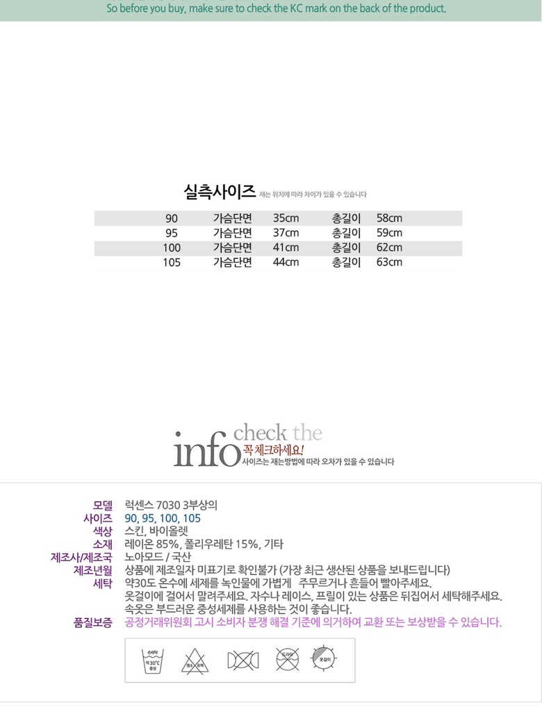 | 6. 세탁방법 및 취급시 주의사항 | 30도 온수로 중성세제를 사용하여 손세탁 및 분리세탁을 권장합니다. |