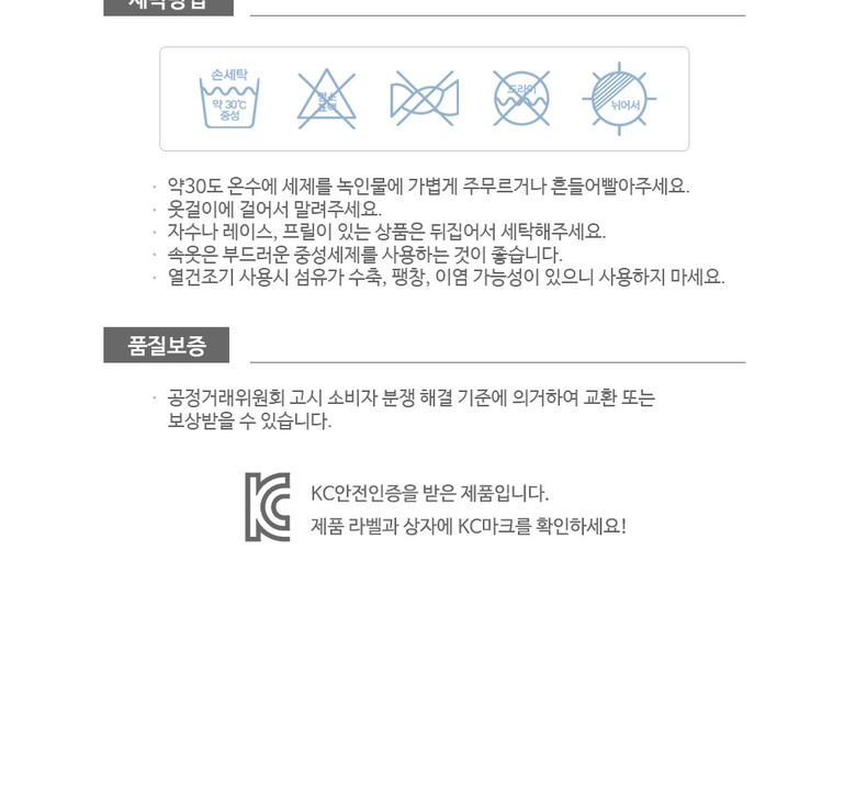 | 6. 세탁방법 및 취급시 주의사항 | 30도 온수로 중성세제를 사용하여 손세탁 및 분리세탁을 권장합니다. |