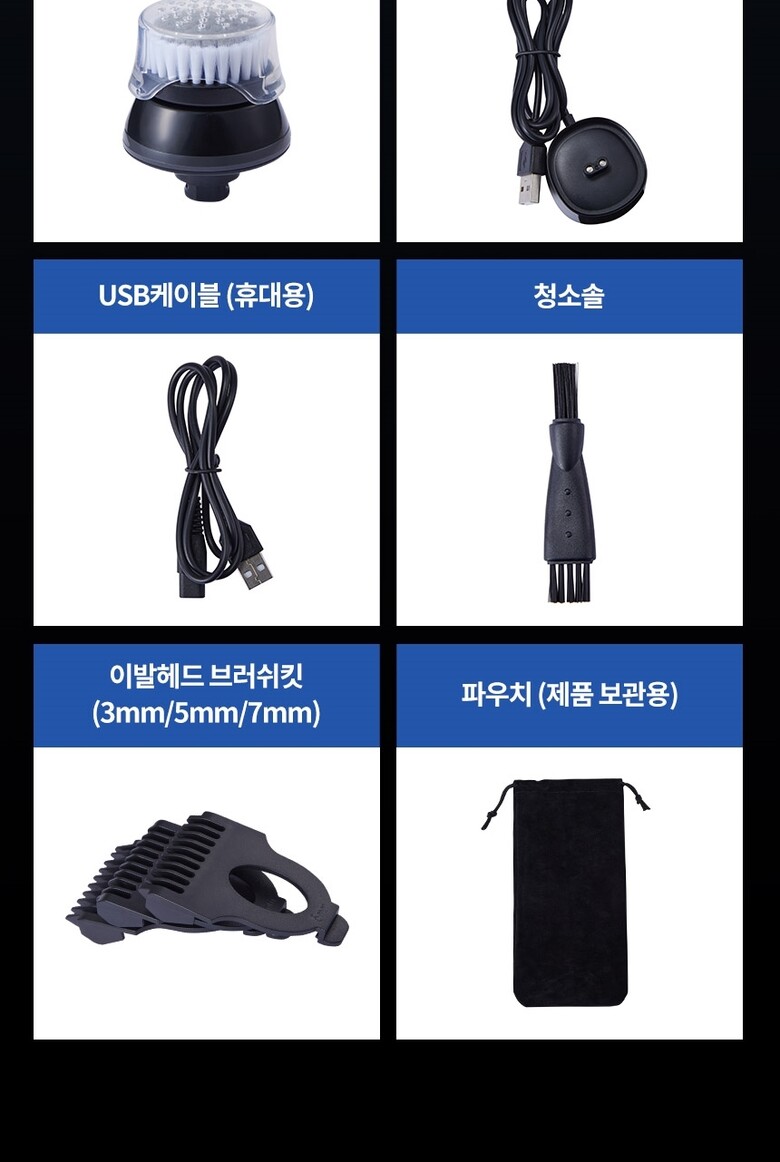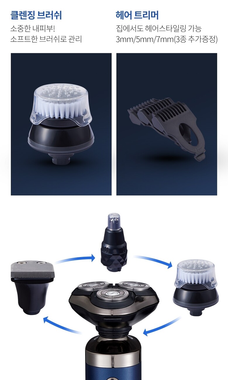 - 전기면도기 배터리타입 : 리튬이온 디스플레이: LED 제품추가구성 : 이발헤드, 면도헤드,콧털제거헤드,클렌징브러쉬