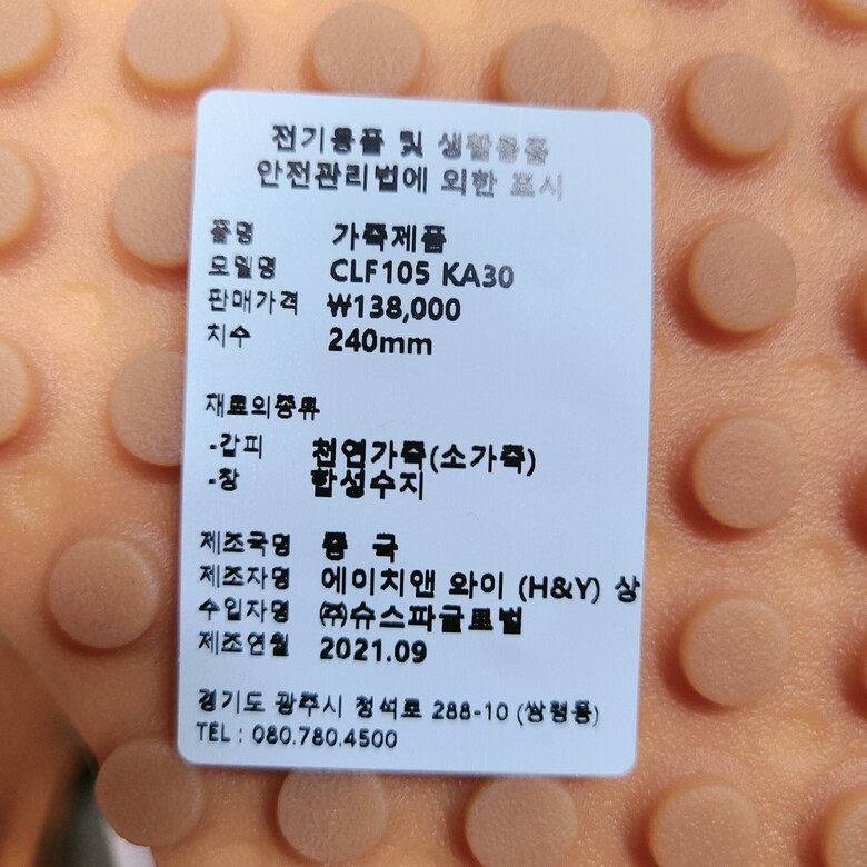 | 1. 제품 소재 (운동화인 경우에는 겉감, 안감을 구분하여 표시) | 소가죽 |