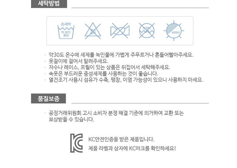 6. 세탁방법 및 취급시 주의사항 30도 온수로 중성세제를 사용하여 손세탁 및 분리세탁을 권장합니다.