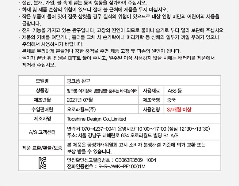 상품불량에 의한 반품, A/S, 품질보증 및 피해보상 등에 관한 사항은 소비자 분쟁해결기준(공정거래위원회 고시) 구매자가 미성년자인 경우에는 상품 구입시 법정대리인이 동의하지 아니하면 미성년자 본인 또는 법정대리인이 구매취소 할 수 있습니다. |