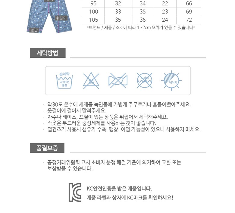 | 6. 세탁방법 및 취급시 주의사항 | 30도 온수로 중성세제를 사용하여 손세탁 및 분리세탁을 권장합니다. |