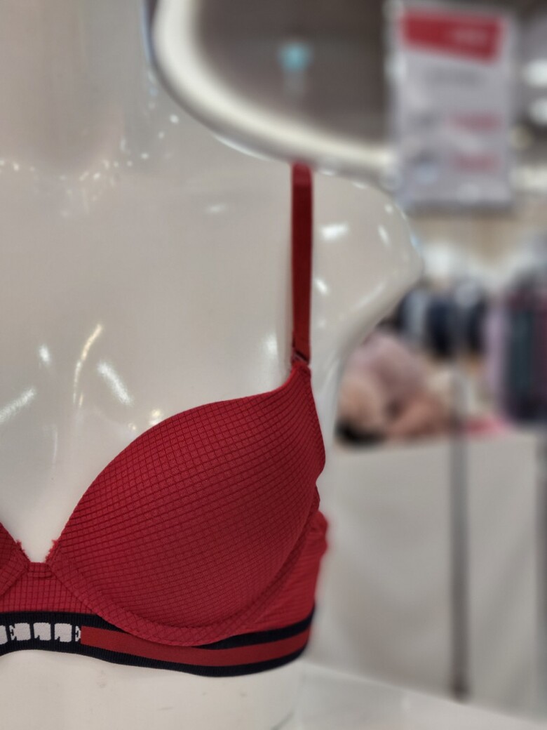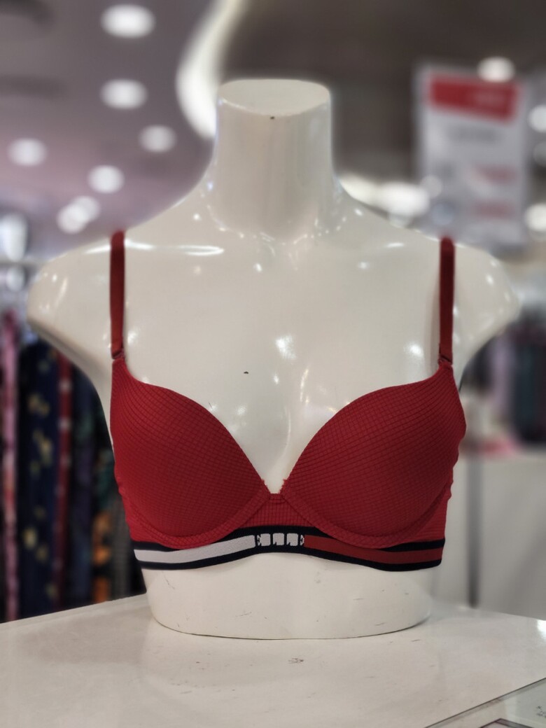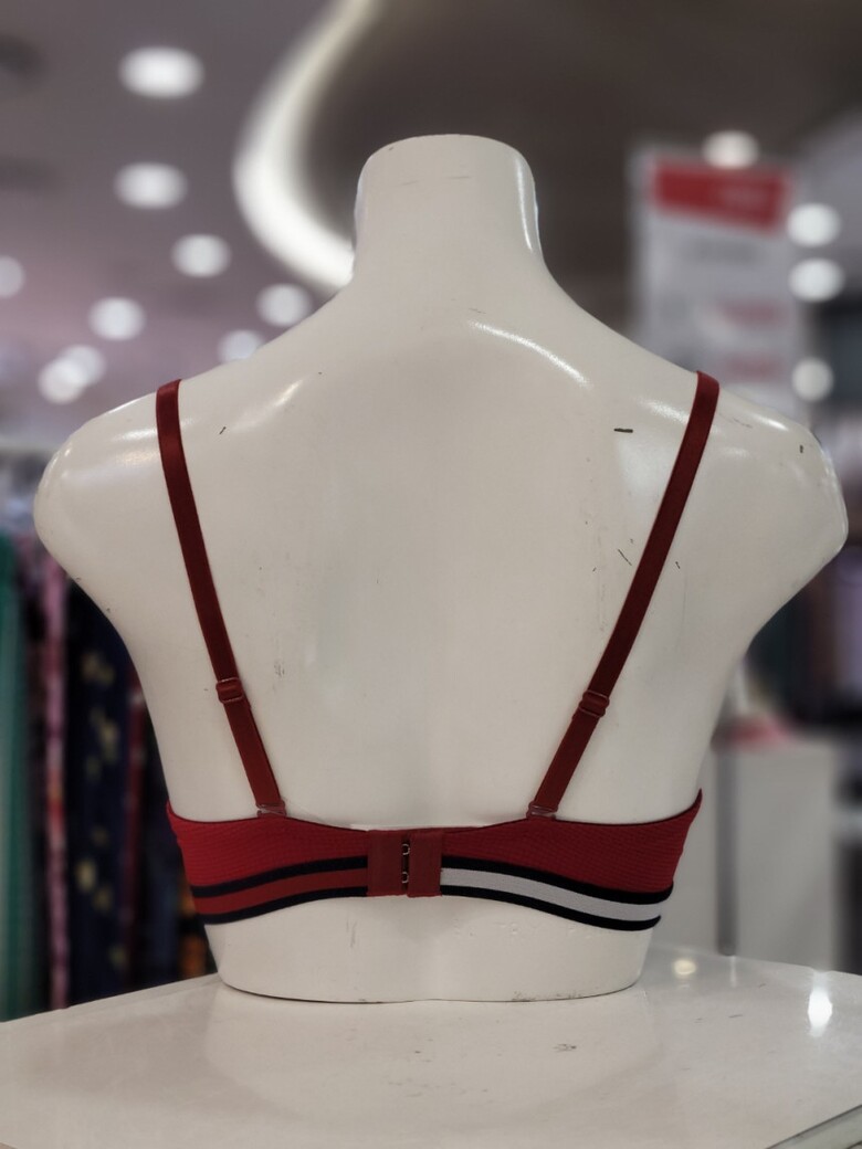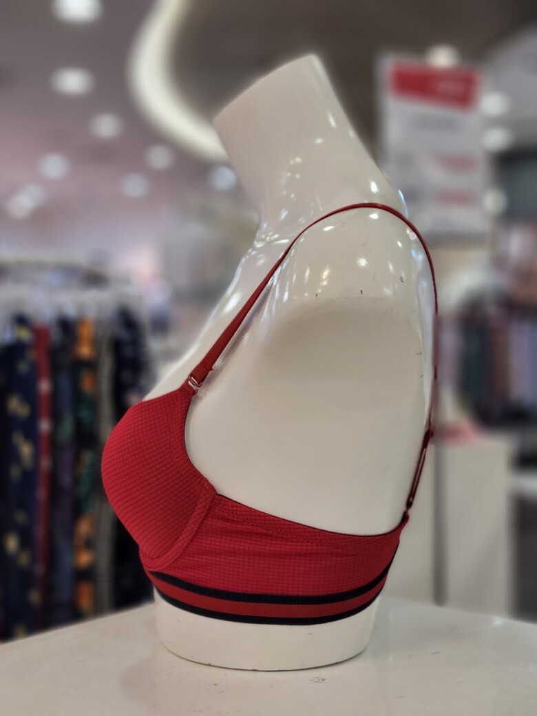 레드 컬러의 웜 매쉬 라인핏 여성 브라입니다.