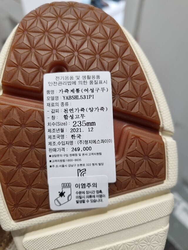 | 1. 제품 소재 (운동화인 경우에는 겉감, 안감을 구분하여 표시) | 양가죽 |