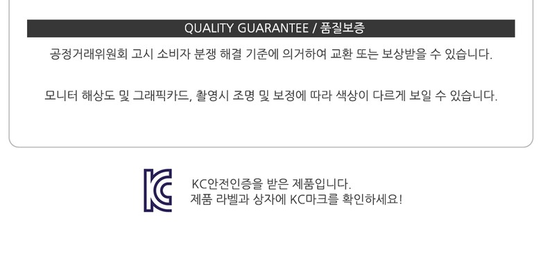 상품불량에 의한 반품, A/S, 품질보증 및 피해보상 등에 관한 사항은 소비자 분쟁해결기준(공정거래위원회 고시) 구매자가 미성년자인 경우에는 상품 구입시 법정대리인이 동의하지 아니하면 미성년자 본인 또는 법정대리인이 구매취소 할 수 있습니다. |