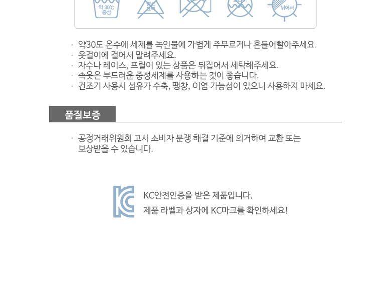 | 6. 세탁방법 및 취급시 주의사항 | 30도온수로 중성세제를 사용하여 손세탁 및 분리세탁을 권장합니다. |
