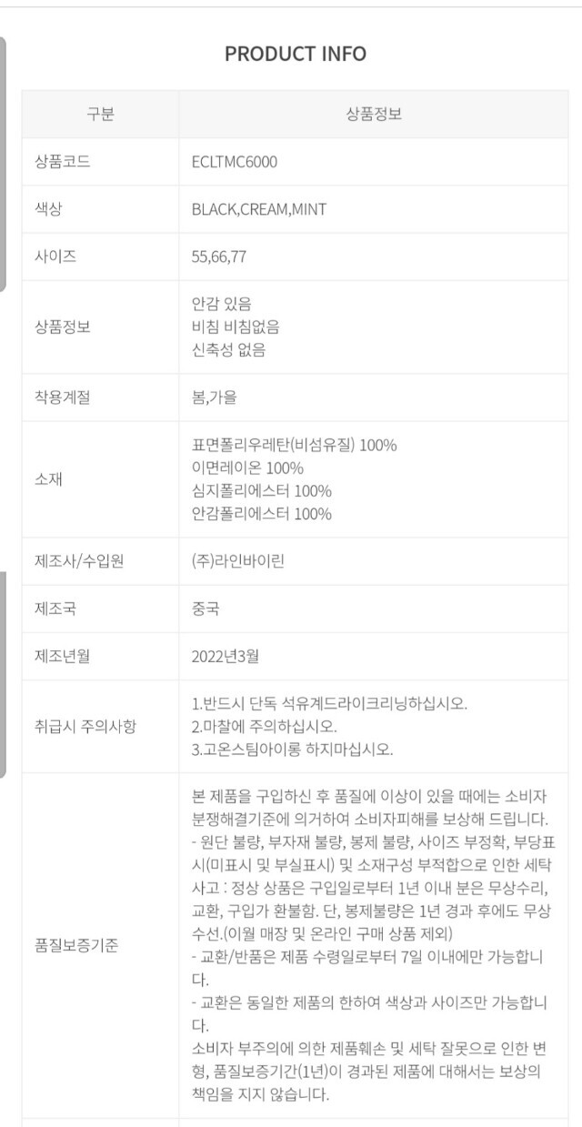 | 6. 세탁방법 및 취급시 주의사항 | 상품상세참조 |