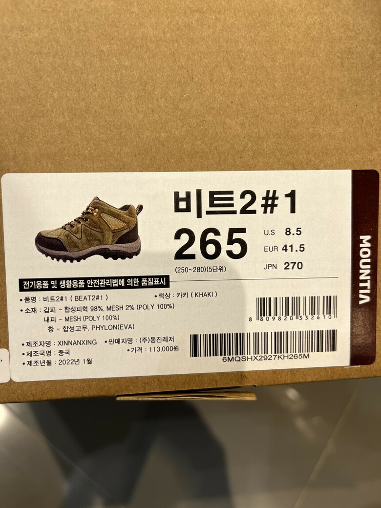 | 1. 제품 소재 (운동화인 경우에는 겉감, 안감을 구분하여 표시) | 갑피 - 합성피역 98% 메쉬2% 내피 -(폴리에스터 100%) 창- 합성고무, |