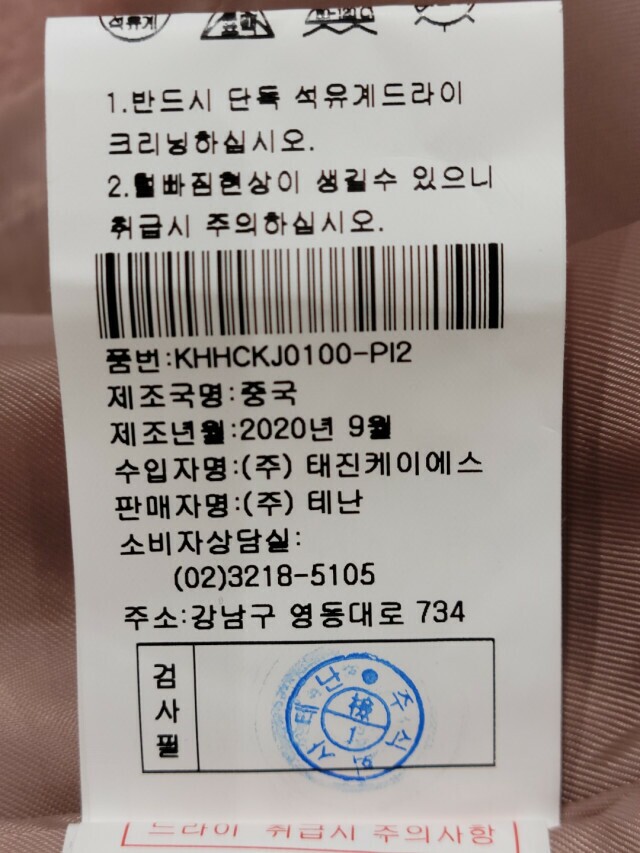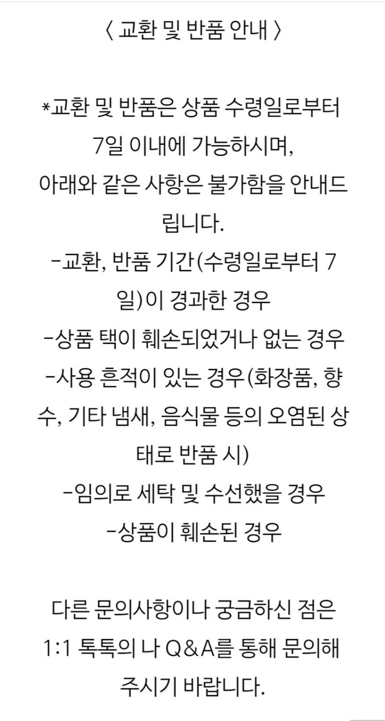 • 처음 배송된 상품상태와 다를 경우(세탁/착용 후 외출하신 경우) 반품이 불가합니다.