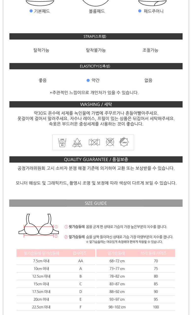 6. 세탁방법 및 취급시 주의사항 30도 온수로 중성세제를 사용하여 손세탁 및 분리세탁을 권장합니다.
