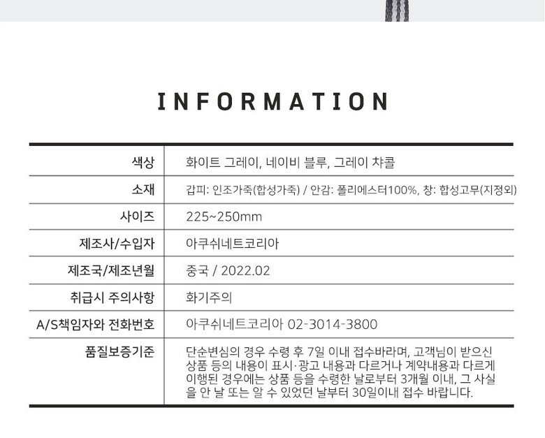 1. 제품 소재 (운동화인 경우에는 겉감, 안감을 구분하여 표시) | 상세페이지 참조 |