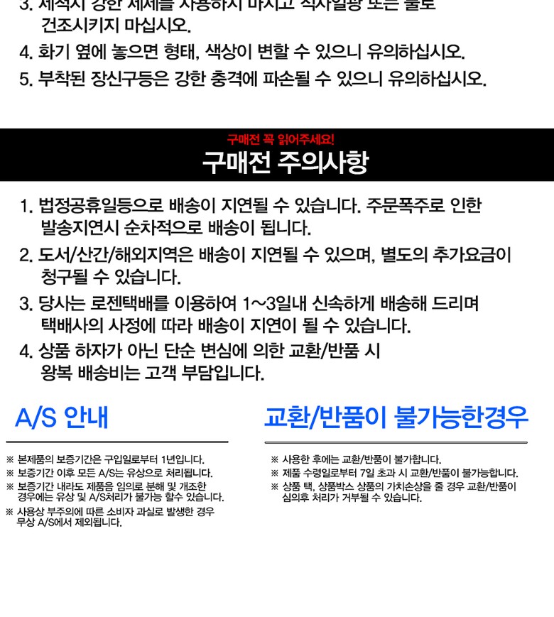 • 모든 규정은 전자상거래법에 의거하며, 택배사정으로 배송이 지연된 경우 재화를 공급받은 날로부터 7일 이내에 반품 가능합니다.