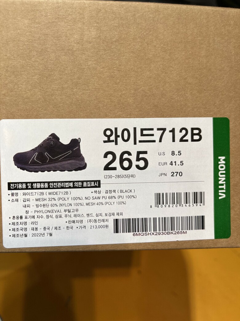 1. 제품 소재 (운동화인 경우에는 겉감, 안감을 구분하여 표시) 갑피 - 메쉬 32%(POLY 100%), NO SAW PU 68%(PU 100%) 내피 - 방수원